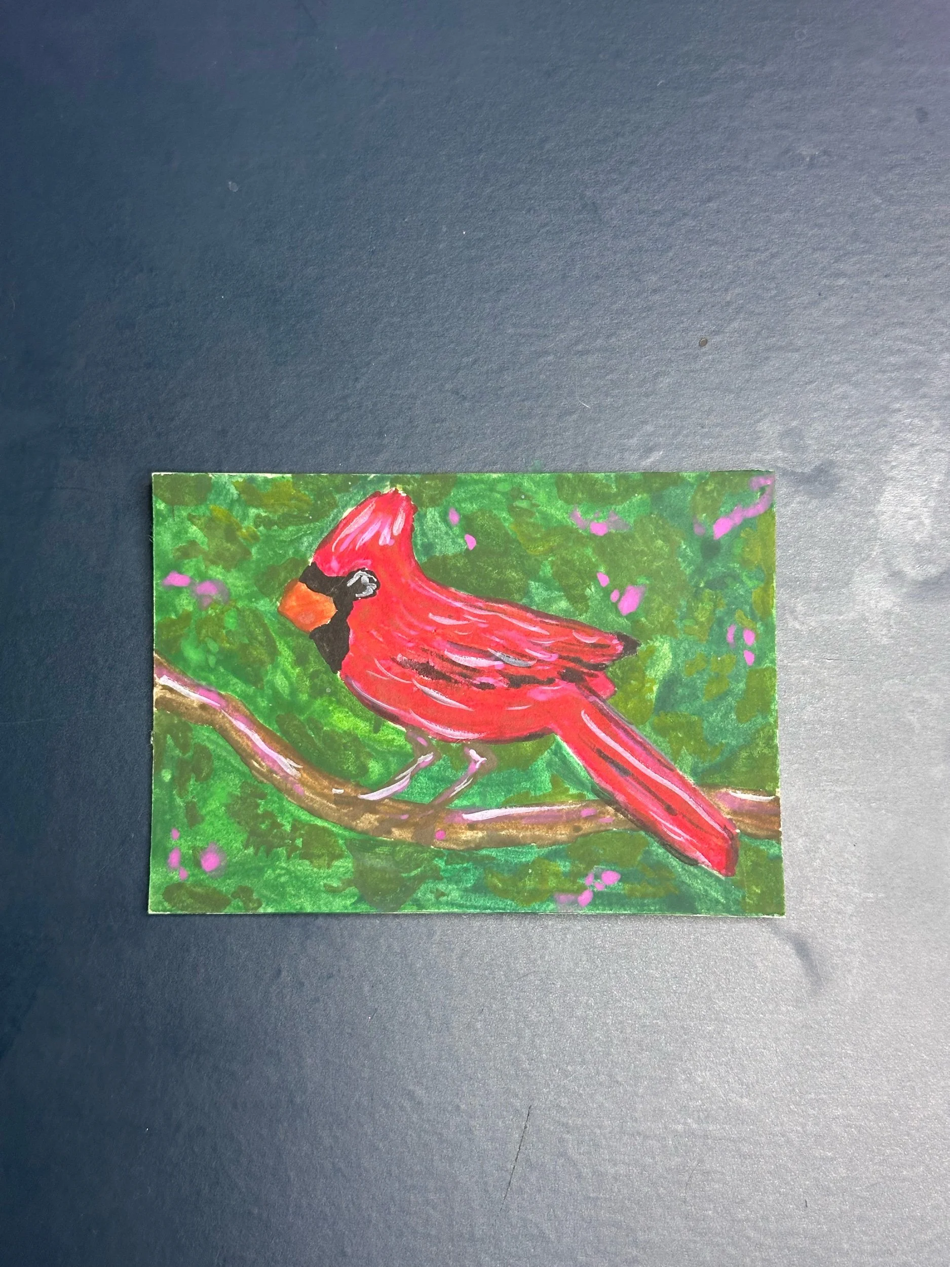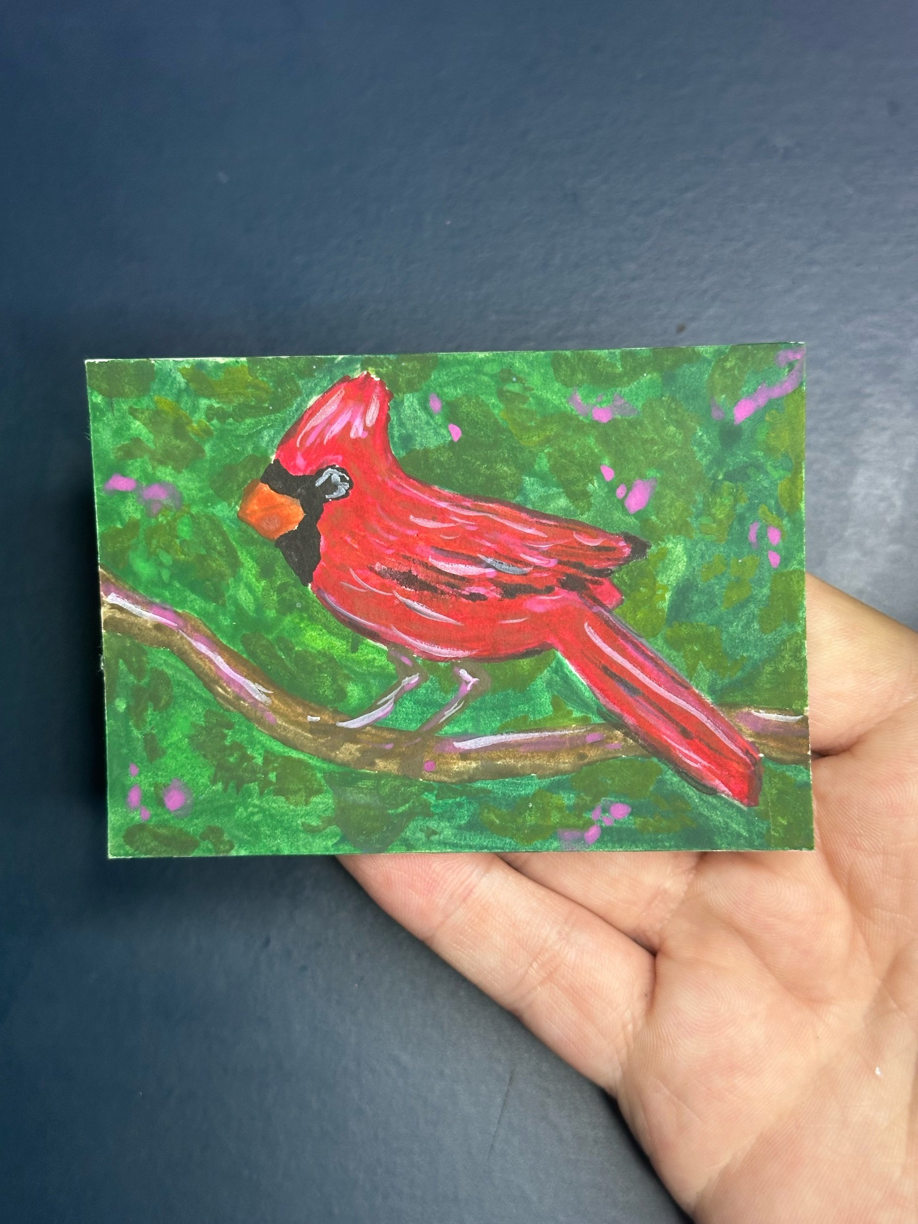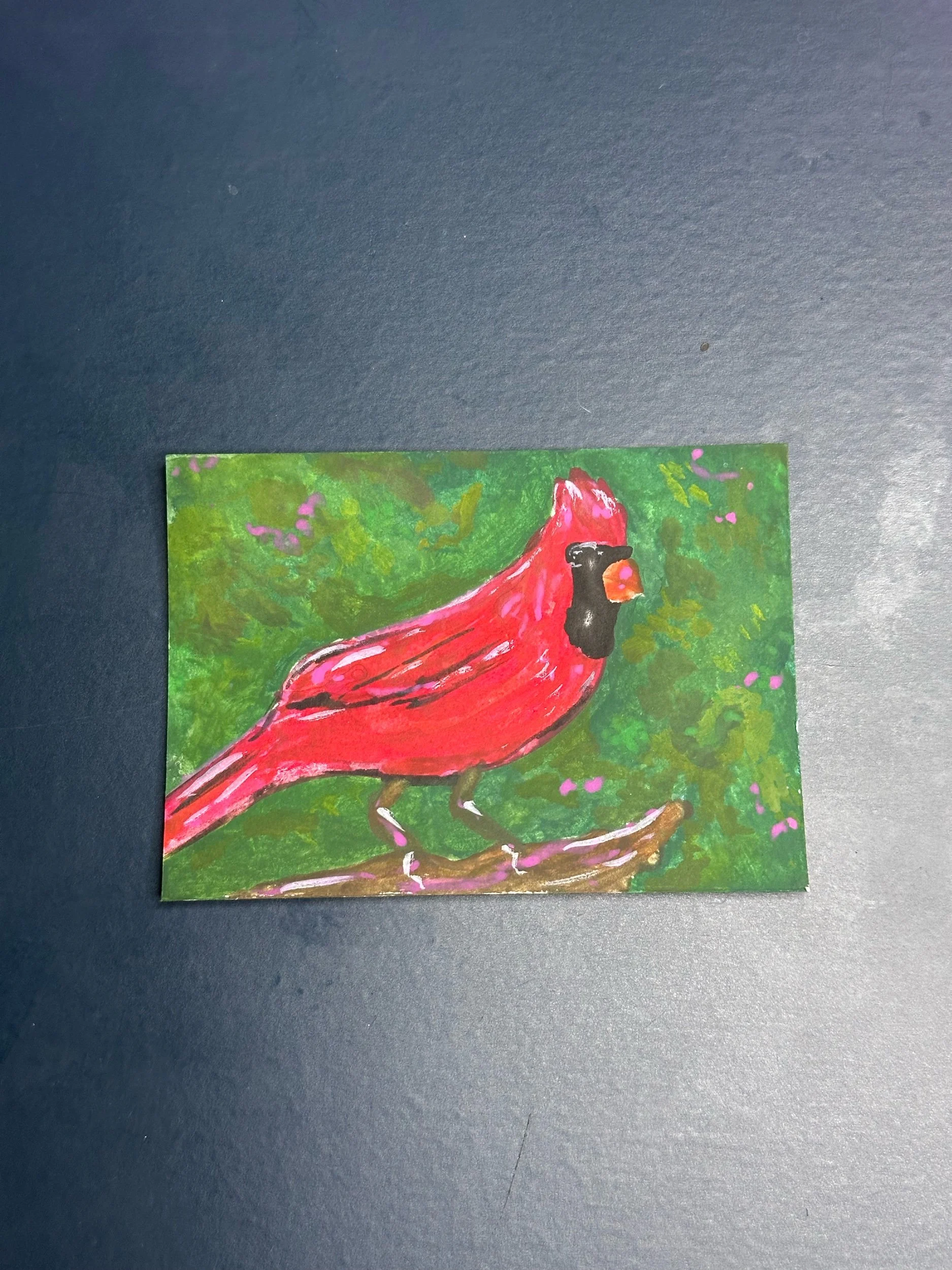 Cardinal ACEO Original Painting • Red Bird Miniature Art • Gouache Wildlife Artist Trading Card