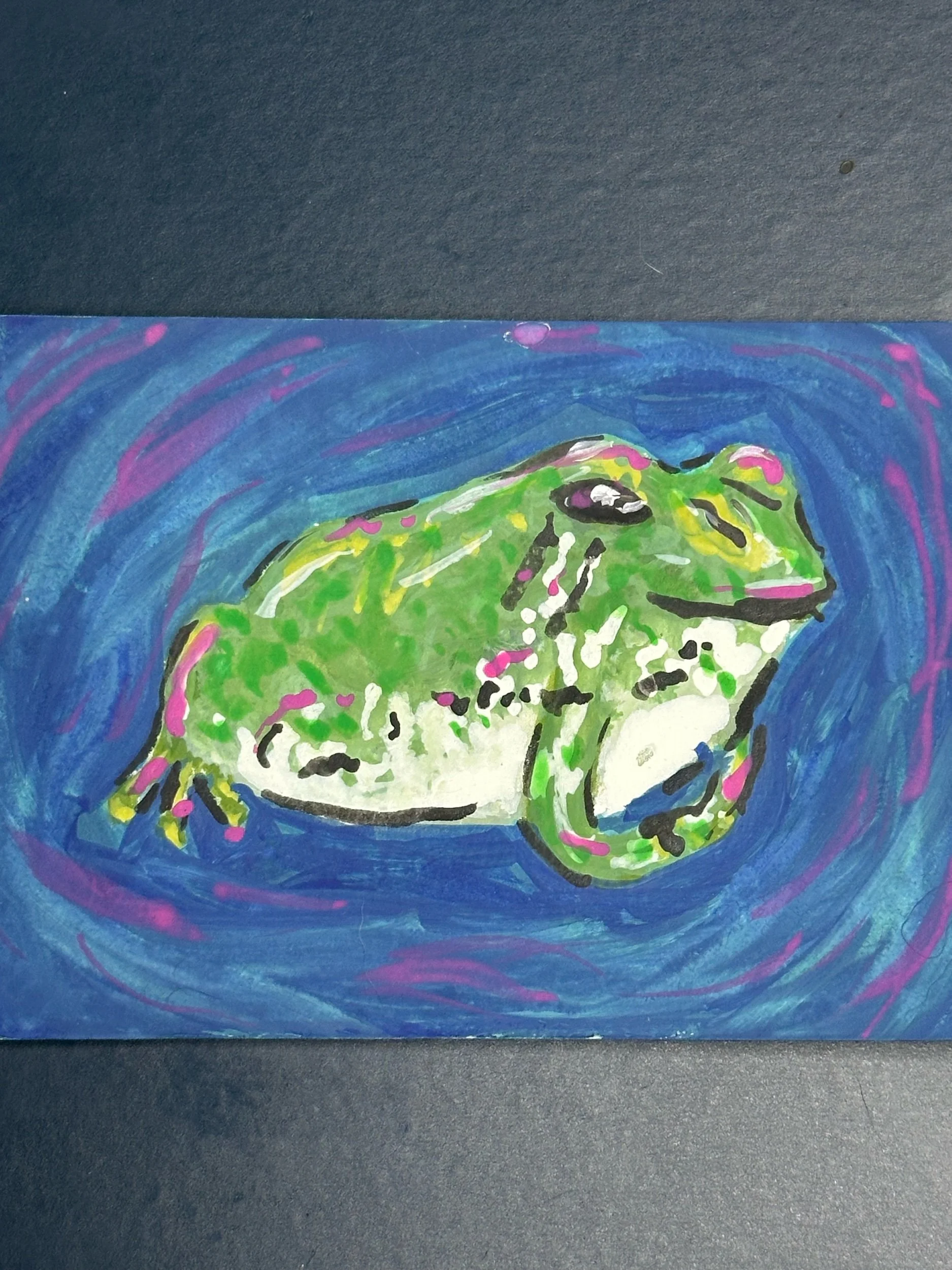 Painted in gouache, this tiny wildlife artwork has bold color, expressive detail, and a classic woodland feel. ACEOs, or Artist Trading Card Editions, are collectible miniature artworks measuring 2.5 x 3.5 inches.
